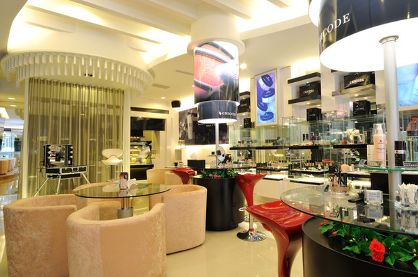 充滿高級質感的化妝品專區裡擺放的是CHICODE知名品牌的保養彩妝試用品,